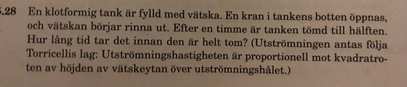 Precis innan denna uppgift fanns en liknande uppgift, fast med vatten i ett badkar, där vattenytans höjd = y. Där var det mycket enklare att bara direkt utnyttja Torricellis lag enligt . Lösningen blev . Alltså fick man två okända konstanter. Men man fick också två tydliga begynnelsevillkor med värden så att man kunde lösa ut både och .