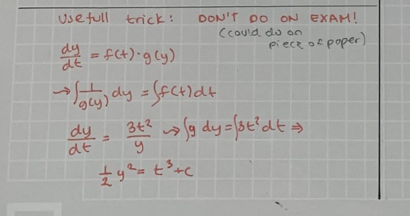 Det assistenten menar man inte får göra på tentan är att använda detta trick nedan för att lösa separabla diffekv. Jag vet tyvärr inte varför , men jag ska kolla upp detta. Jag tycker också man borde få använda standardmetoden. Men facit finns däruppe där det står 8 under section 2.2