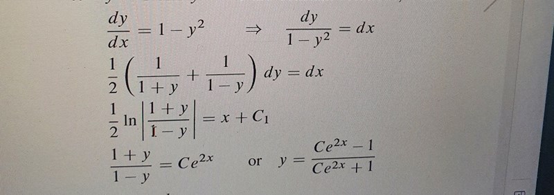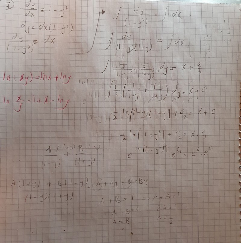 Hmm facit är förvirrande. ln av (1-y) + ln(1+y) kan ju skrivas som ln|(1-y)*(1+y)| så hur skrev de det som bråk?? Och hur försvann 1/2 ???