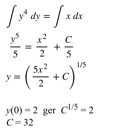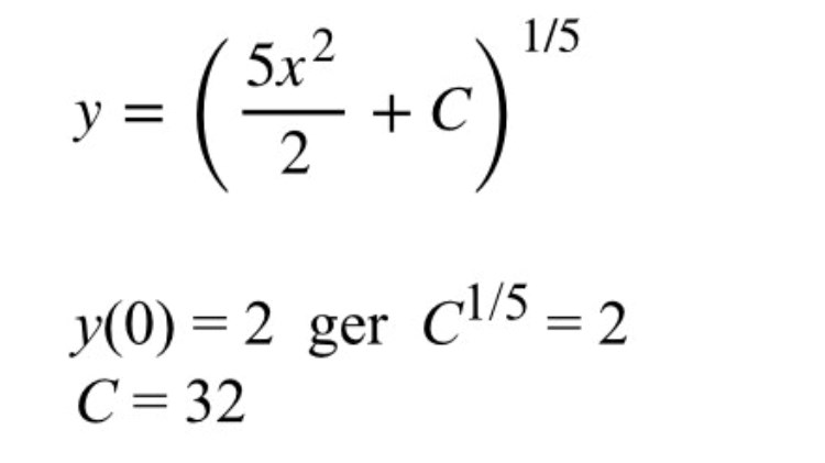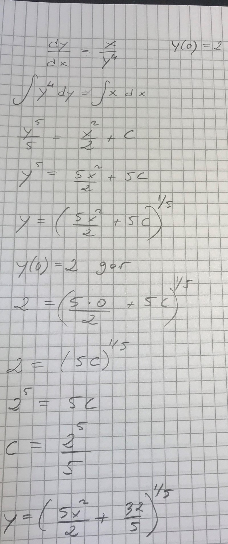 y(0) = 2 till 2 = (5C)^(1/5) och löser jag ut C får jag 32/5 och inte 32