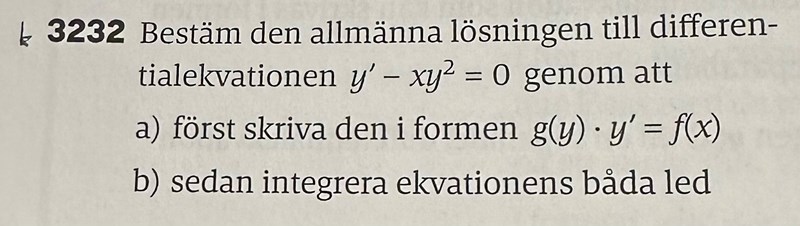 Hej! Jag förstår inte hur jag ska lösa b)-uppgiften? Jag löst a) och fått y’ / y2 = x