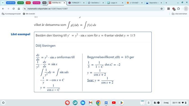1/y=cos(x) + C (eller +D om man skall vara noggrann)