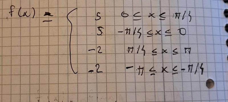 fjämnx=5  -π/4<x<π/4-2  -π<x-π/4 eller π/4x<π\displaystyle f_{\text{jämn}}\left(x\right) = \left\{ \begin{array}{rl}5\ \ & -\pi/4 < x < \pi/4 \\ -2\ \ & -\pi < x \le -\pi/4\text{ eller } \pi/4 \le x < \pi \end{array}\right.