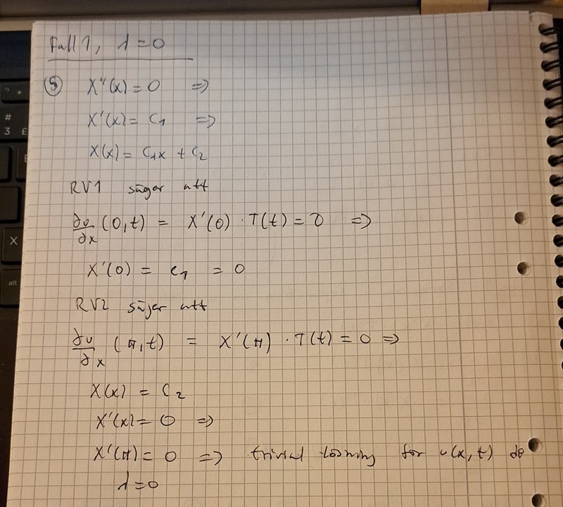 Jag kan visa min lösning på fall 1 där lambda =0 där X(x) blir 0 och u(x,t)=0 pga trivial lösning så får vi ta det därifrån. Jag använde båda randvillkoren. Se bilderna nedan.