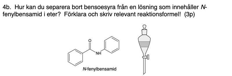 Hej! Sitter med den här uppgiften jag är osäker på. Jag tror att svaret nog är att man ska lägga till en basisk lösning vatten? För då kan bensoesyran reagera och bilda ett salt vi kan få ut? Eller att vi får två skikt i den där funneln på bilden i och med att fenylbensamiden löser sig i etern och är opolär? Är helt vilse på reaktionsformel dock, måste formeln ta bådas reaktioner i åtanke eller bara bensoesyrans?