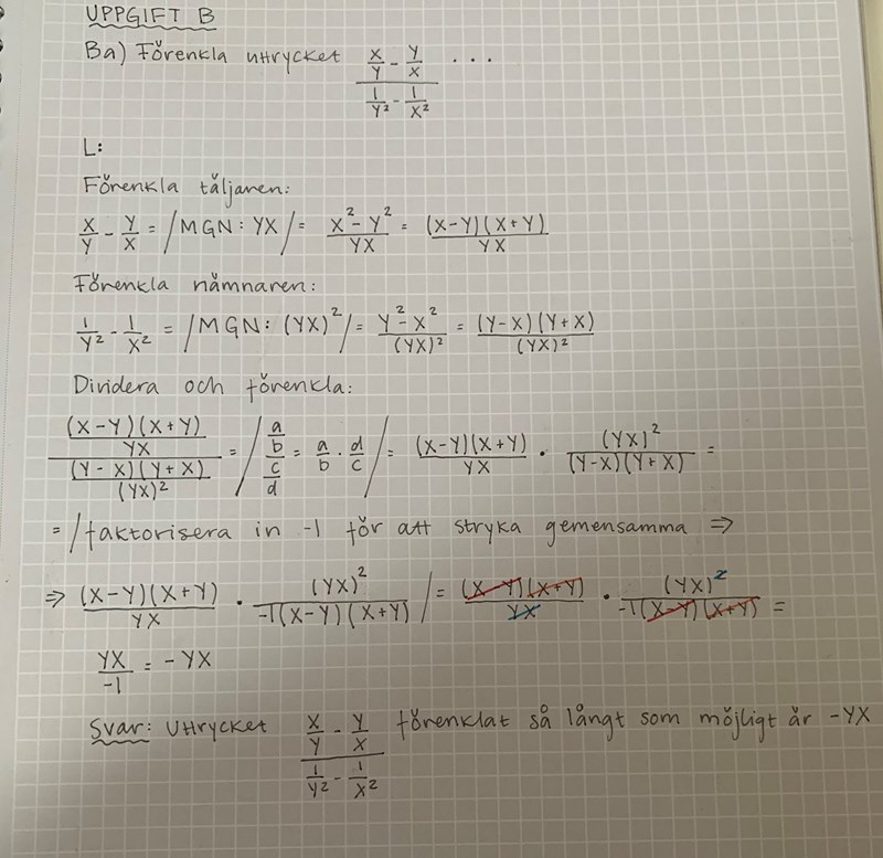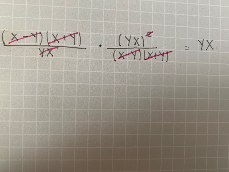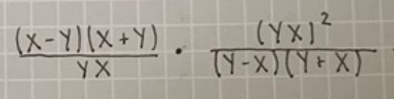 Okej, förstår! Felet ligger i att det ska bli x2-y2/(yx)2 istället? Vilket gör att man med konjugatregeln kan skriva (x-y) (x+y), och därmed behöver jag inte faktorisera in -1 utan kan stryka de gemensamma direkt...?