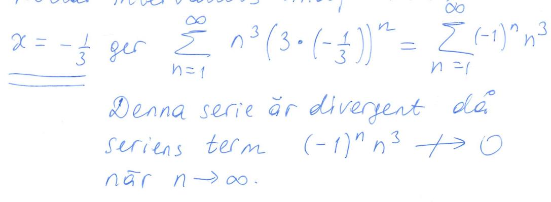 Jag är lite förvirrad angående hur man får att serien inte går mot noll... Jag förstår att n^3 går mot oändligheten när n går mot oändligheten, men det känns som att (-1)^n alternerar och att det borde gå med Leibnitz kriterium, men samtidigt har jag insett att serien inte stämmer in för Leibnitz kriterium. Så hur ska man egentligen tänka för att veta att den inte går mot 0?