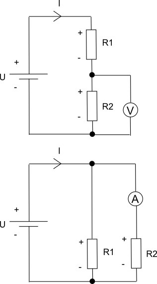 I den övre kretsen mäts spänningen över R2 och i den nedre mäts strömmen genom R2