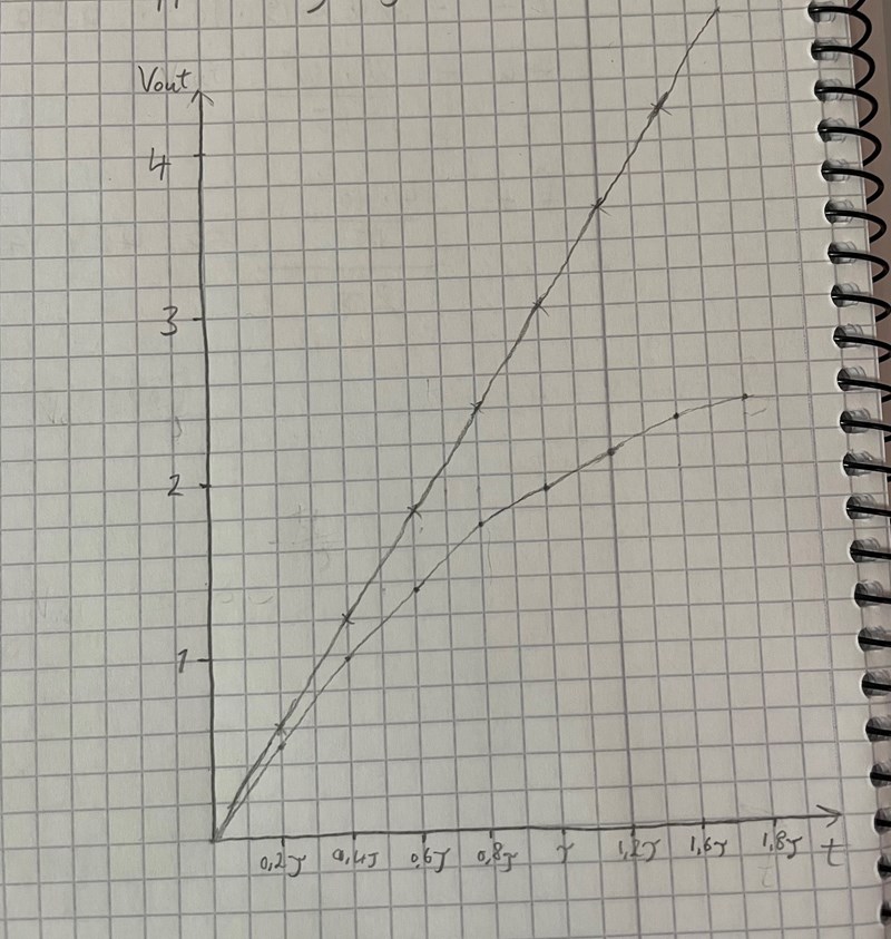 Hur ser Vout(t) ut i verkligheten? När blir skillnaden 10 % ?Menar du att den inte kan vara linjär eller inte kan vara exponentiell? För den blir ju linjär om man ritar den utifrån integralberäkningarna