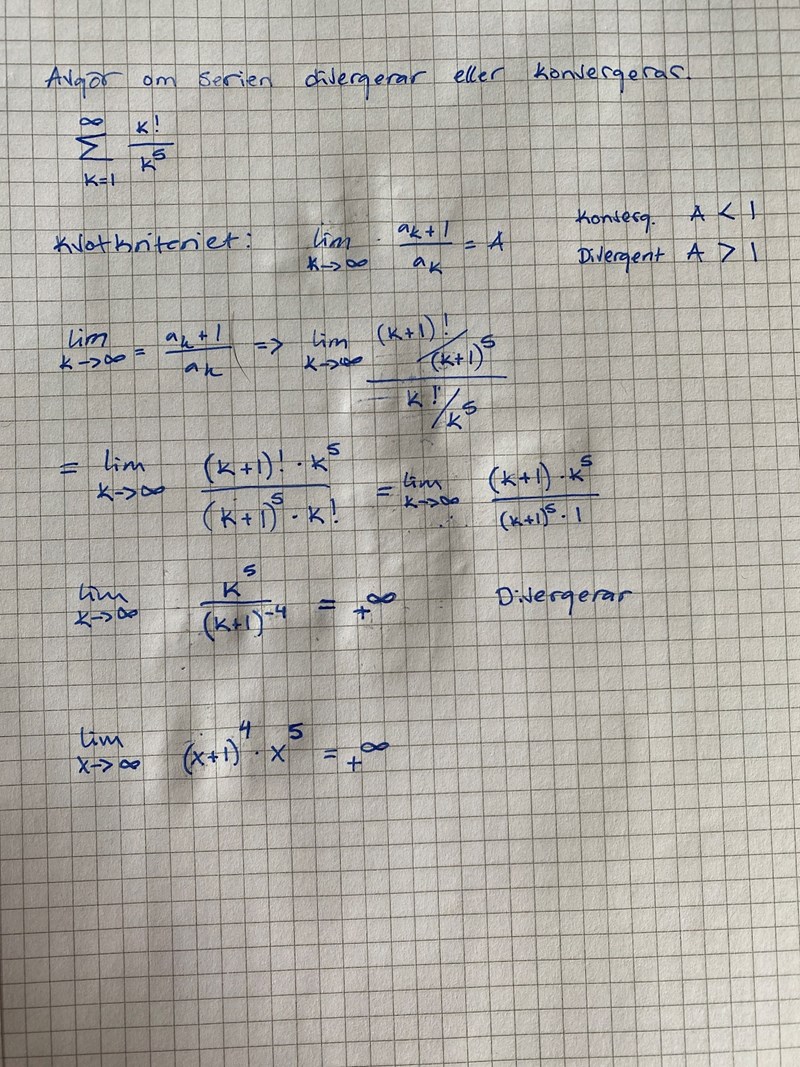 Har tyvärr inget facit till denna uppgift, behöver jag förklara mer varför k^5/(k+1)^-4 går mot positiva oändligheten? Har tenta nästa vecka...