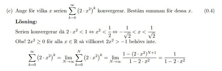 - Detta är en geometrisk serie med kvoten (2x2 ) . Geometriska serier konvergerar om kvoten <1.