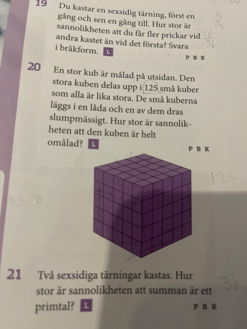 Frågan som ställs är sannolikheten för att dra en kub som inte är målad dvs Vilket ger