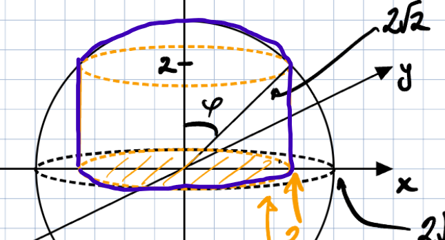 Först trodde jag att phi: 0 --> pi/2, som för en halvsfär, men det var fel, man kan ju räkna ut phi genom att ta arccos z(max)/R (=roten ur 8), men jag skulle tro att z(max) också är roten ur 8 därmed blir det samma resonemang.