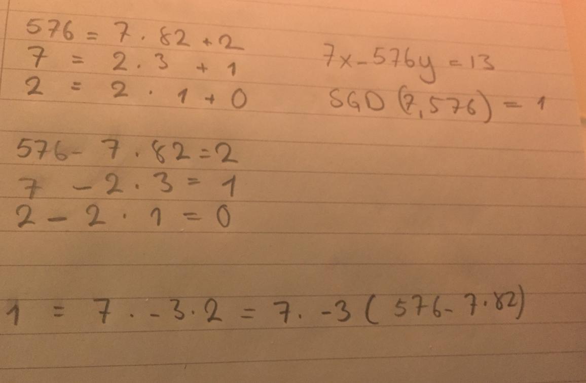 Jag vill räkna ut SGD för ( 7 , 576)  och i min uträkning längst ner har jag försökt använda mig av den förlängda versionen av euklides algorithm (extended euclidean algorithm) men är inte fullständigt klar med den och behöver hjälp med hur jag ska fortsätta.