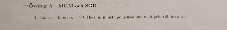 SGD(45,50)=5. Enligt formeln är MGM(45,50)=45*50/SGD(45,50)=2250/5=450