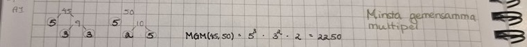 rapidos skrev:45=3*3*5; 50=2*5*5. Talen har alltså en 5 gemensamt, så den räknas 1 gång, dvs MGM(45,50)=3*3*2*5*5=450.