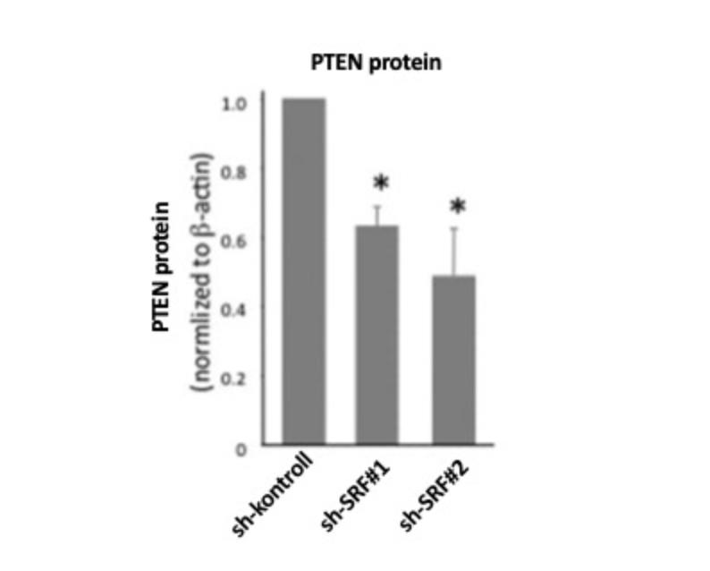Effekten av två olika shRNA riktat mot transkriptionsfaktorn SRF (sh-SRF#1 och sh-SRF#2), jämfört med kontroll-shRNA (sh-kontroll), på PTEN:s protein-nivå visas i bifogad figur. Forskarna mätte även effekter på PTEN-mRNA, som visade sig inte påverkas av shRNA mot SRF (visas ej i figur).