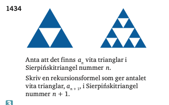 Mitt svar:an+1 =an + 3n För n 1 och a1 = 1Facit:an+1 = 3an + 1där a1 = 0