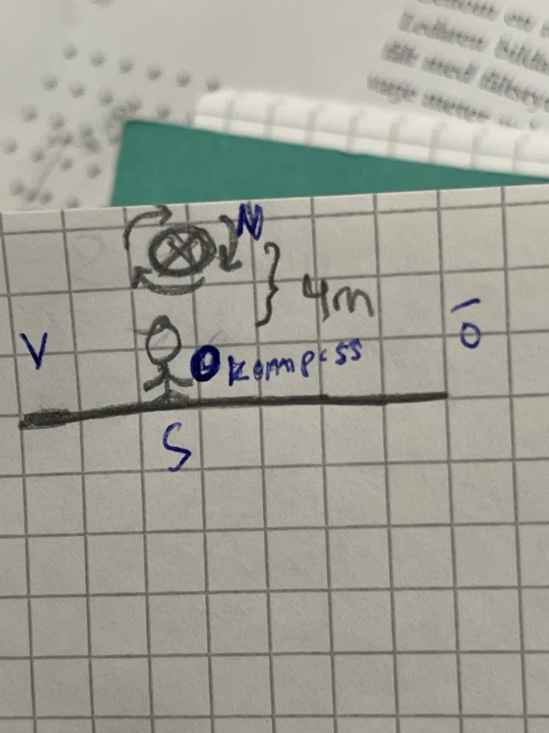 Om du känner att det blir för krångligt så kanske det blir enklare om du ritar Simon, kompassen och den strömförande ledningenn uppifrån. Låtsas att du är en fågel som flyger ovanför den strömförande ledningen och att du tittar rakt ner på den, Simon och kompassen. Hur ser din vy ut då?