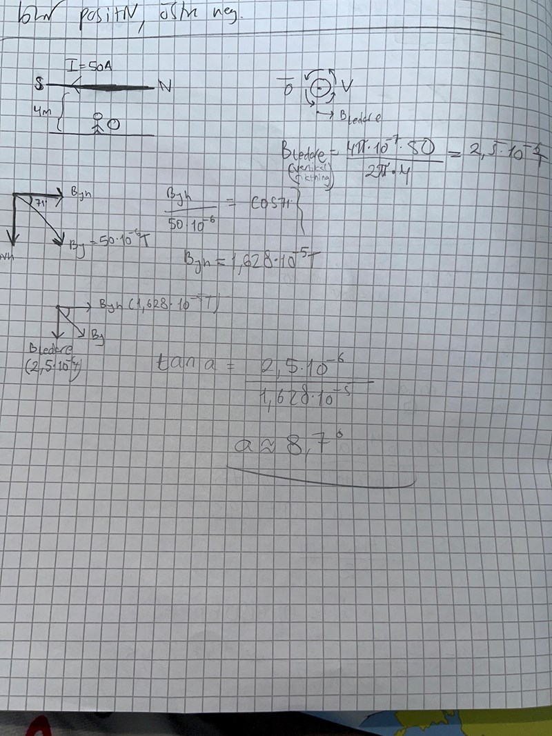 Simon är ute och orienterar i Sverige. När han ska läsa av sin kompass står han rakt under en strömförande ledning, där strömmen går från norr till söder. Hur mycket fel kommer hans kompass att visa om ledningen är 4,0m ovanför Simons kompass och strömmen i den är 50A?