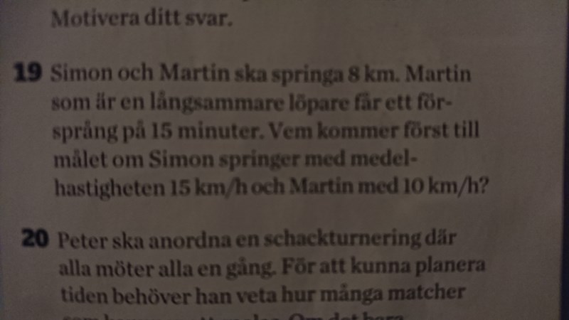 Du vet hur fort de kan springa, Simon 15 km/h och Martin 10 km/h.