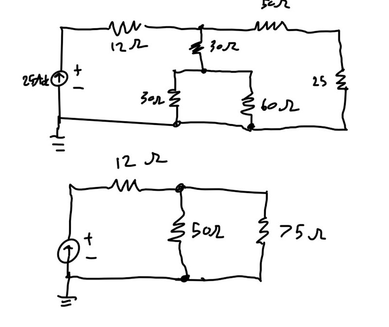 (50//75)+12 eftersom det finns två vägar för strömmen att flöda i noden som ansluter resistorerna med 50 respektive 75 ohms resistans.