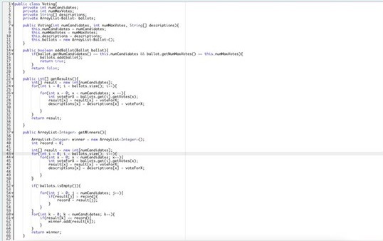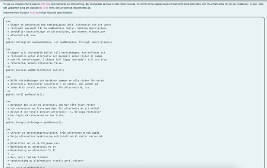 Hej! Jag har fått i uppgift att simulera en omröstning. Klassen Vote består av en samling av insamlade röstsedlar (s.k ballots) där man på varje röstsedel kan sätta numMaxVotes antal röster. Se specifikationer och beskrivningar nedan. I metoden "getWinners" skall den eller de alternativ som finns att rösta på, som fått högst röster, returneras i en lista men jag får detta felmeddelande. Kan någon säga vad felet är med min metod? Jag får enligt webbplatsen felmeddelandet att metoden inte funkar med 1 vinnare.