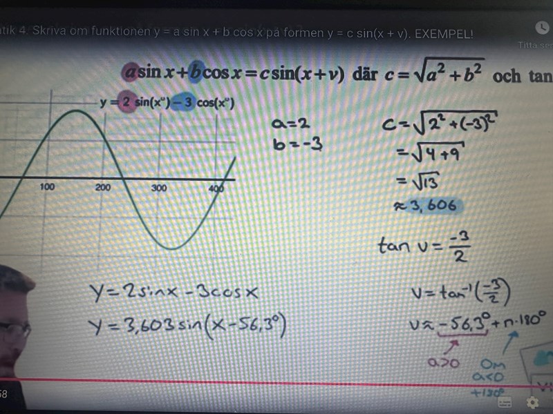 Men funktionen du utgick ifrån y=2 sin x - 3 cos x har perioden 360 grader. Alla lösningar till ekvationen kan alltså inte vara lösningar som passar till den ursprungliga funktionen.Den ena passar till uttrycket y = 2 sin x - 3 cos x. Den andra passar till y = -2 sin x + 3 cos x