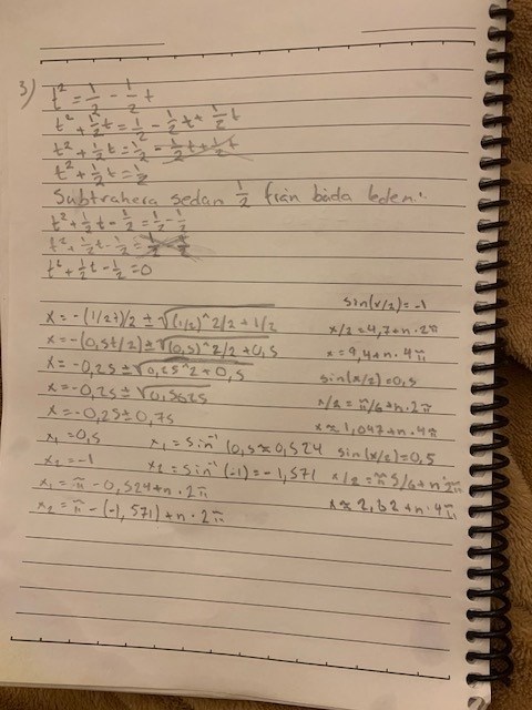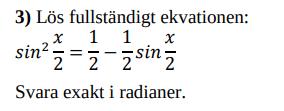 OK, du kan få ett tips för den här uppgiften: Börja om från början. Sätt sin(x/2) = t. Lös andragradsfunktionen. Sedan kan vi fortsätta här.