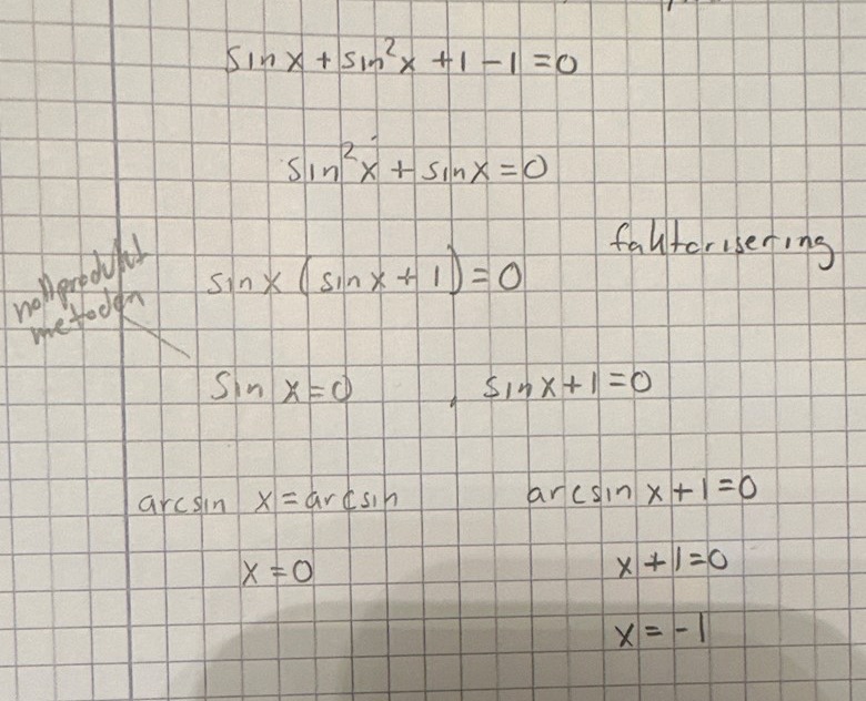 Nollproduktsmetod handlar om att kolla när varje faktor är lika med noll. I det här fallet har du två faktorer, sin(x) och sin(x) + 1. Du behöver lösa ut när dessa är lika med noll vilket ger två ekvationer som måste lösas.