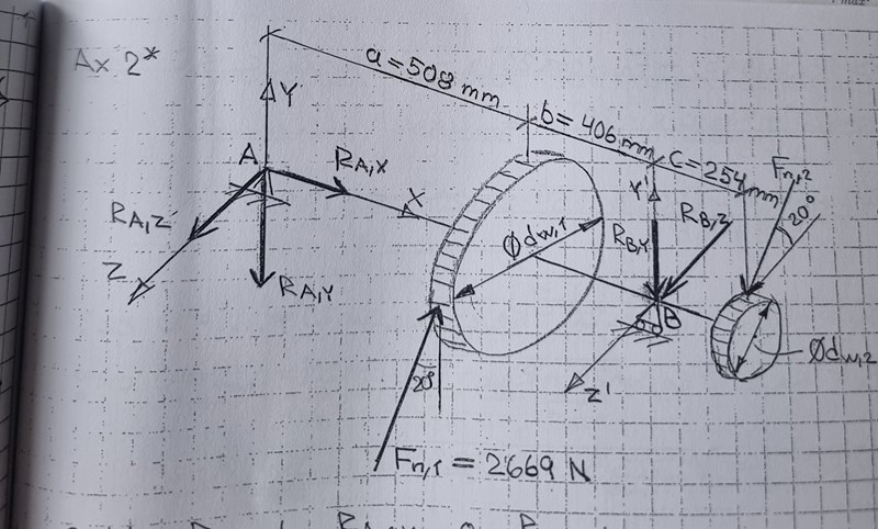 Hur kommer det sig att Fn1*cos(20) ger upphov till moment runt z lager A? För mig känns det mer logiskt att det blir Fn1*sin(20)