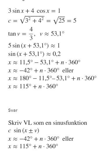 I facit väljer de 5. Sedan beräknar de vinkeln med tan v=4/3 och får v=53.1 som ena lösningen. Men för att få två lösningar, varför tar man 180-53,1 = 115 ?