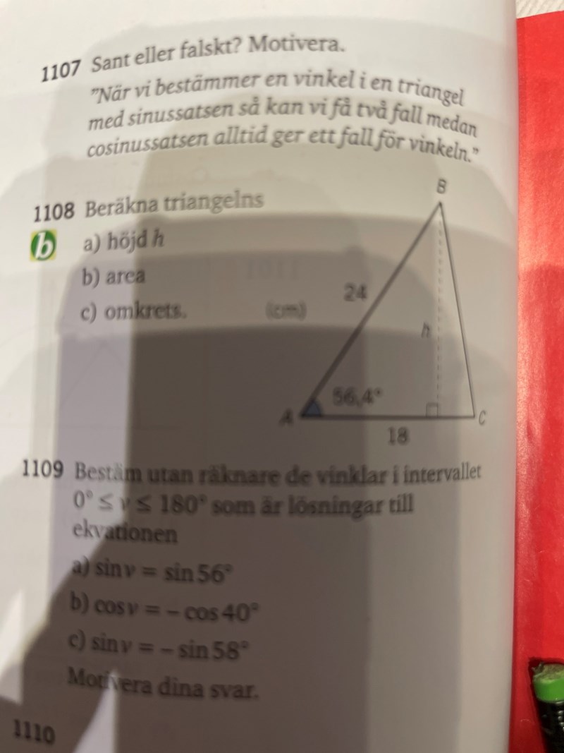 jag undrar hur det kommer sig att svaret i uppgift 1107 är sant. Ger inte sinussatsen och cosinussatsen enbart en vinkel?