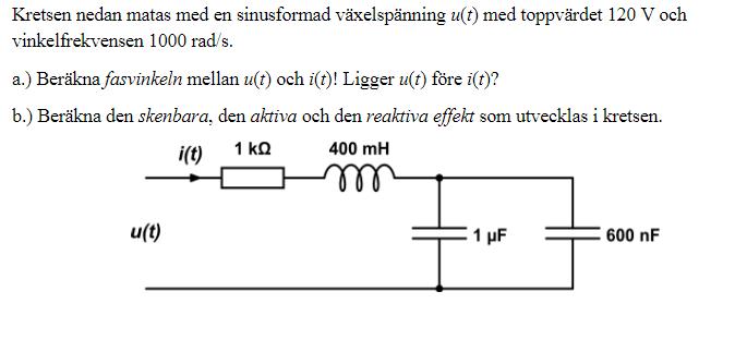 Har lite problem med uppgift (a). Jag vet att samt att . Jag räknar ut att impedansen (detta är rätt enligt facit). Men hur förklarar detta vad gäller om u(t) ligger före/efter i(t)?