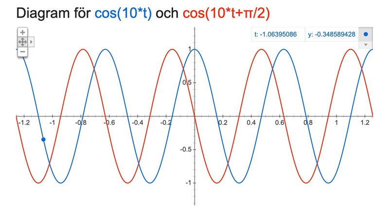 Då ser du att den blå kurvan ligger 90o före den röda kurvan.