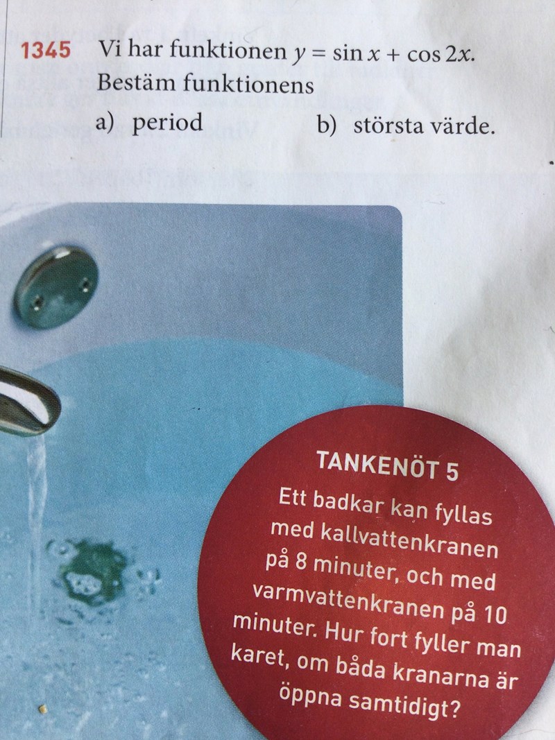 Jag hade skissat upp grafen till funktionen sin(x) respektive grafen till funktionen cos(2x), sett efter när de är i takt till varandra för att få perioden, och se efter om de någon gång får att sin(x)=cos(2x)=1, för då vet vi att maximum för båda uppnås samtidigt och max blir 2. Om detta aldrig inträffar hade jag studerat hur grafen skulle se ut för att få ett ungefärligt hum om vilket x-värde som ger max och tänkt efter vad det borde motsvara för de två funktionerna, för att se om det är ett snällt värde.