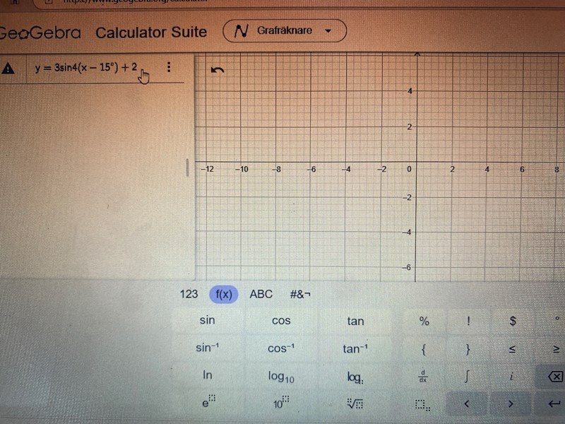 Tog och försökte kolla nu men verkar som att det inte går. Men jag tror att felet är att det står sin4(x - 15). Det borde istället stå sin(4(x - 15)) eller något.