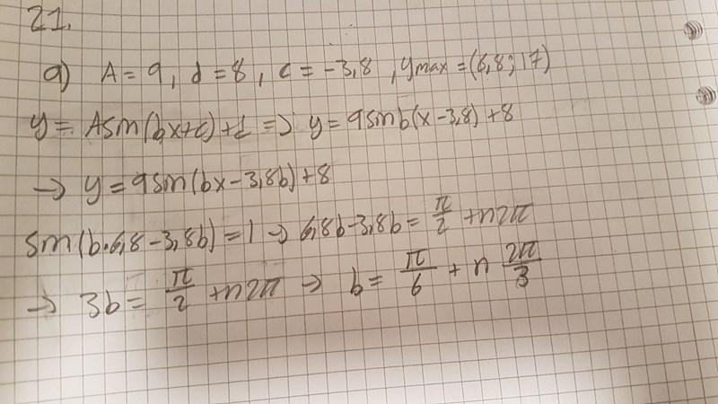 Jag skulle behöva lite hjälp med att teckna en sinuskurva på formen Y = Asin (bx+c) + d, enligt uppgiften nedan. Jag har fått fram A resp. d. Problemet är b. Som ni ser nedan (i mina beräkningar) får jag ut b genom att utnyttja maximipunktens koordinater, då måste ju sin (bx+c) = 1. Löser jag denna ekvation får jag att b = pi/6 + n*pi. Sätter jag b = pi/6 i funktionen så får jag rätt graf i min grafräknare. Problemet är att enligt mitt ekvation så borde även 5π/6 vara en lösning, etc. Dock så ger detta värde ett helt annat utseende på grafen, men ändå rätt lösning till ekvationen Hur går detta ihop?