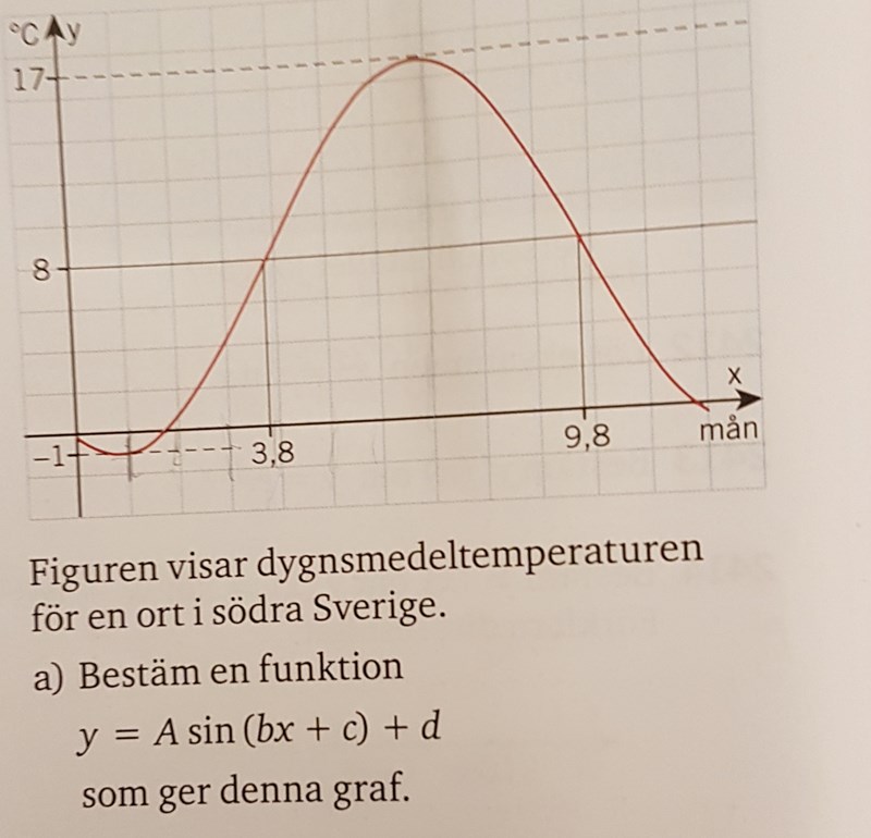 Har bara en fråga, jag förstår inte riktigt (även om det är korrekt) hur T/2 = 9,8-3,8 (vilket ger b = pi/6)? Det jag vet är att en hel period är ex. mellan två maximipunkter eller minimipunkter och att en halv period (T/2) är mellan en maximipunk och en minimipunkt eller tvärtom. I detta fall är det varken eller. Men om vi leker med tanken och antar att koordinaterna (3,8 och 9,8) istället var, låt säga, (5,8 och 7,8) då blir ju differensen (linjen mellan punkterna) kortare och vi får således ett annat värde på T. Jag är säkert helt ute och cyklar nu, men önskar verkligen att jag lyckas förstå detta. Hoppas du förstår hur jag tänker och förhoppningsvis kan komma med ännu ett pedagogiskt svar. Tack på förhand :)