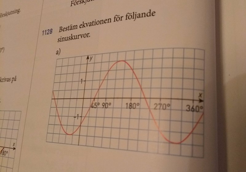 Jag har lite svårt att hitta förändringsfaktorn för perioden utifrån denna graf. Jag har däremot kommit fram till att amplituden är 2 och att förskjutningen på x-axeln är (x-45).