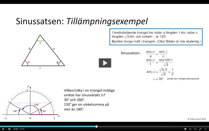 Om vi vet om att en av vinklarna är 120 grader och en annan vinkel är antingen 30 eller 150 grader så kan denna andra vinkel omöjligen vara 150 grader eftersom att vi i så fall skulle få en vinkelsumma på minst 120+150= 270>180 grader.