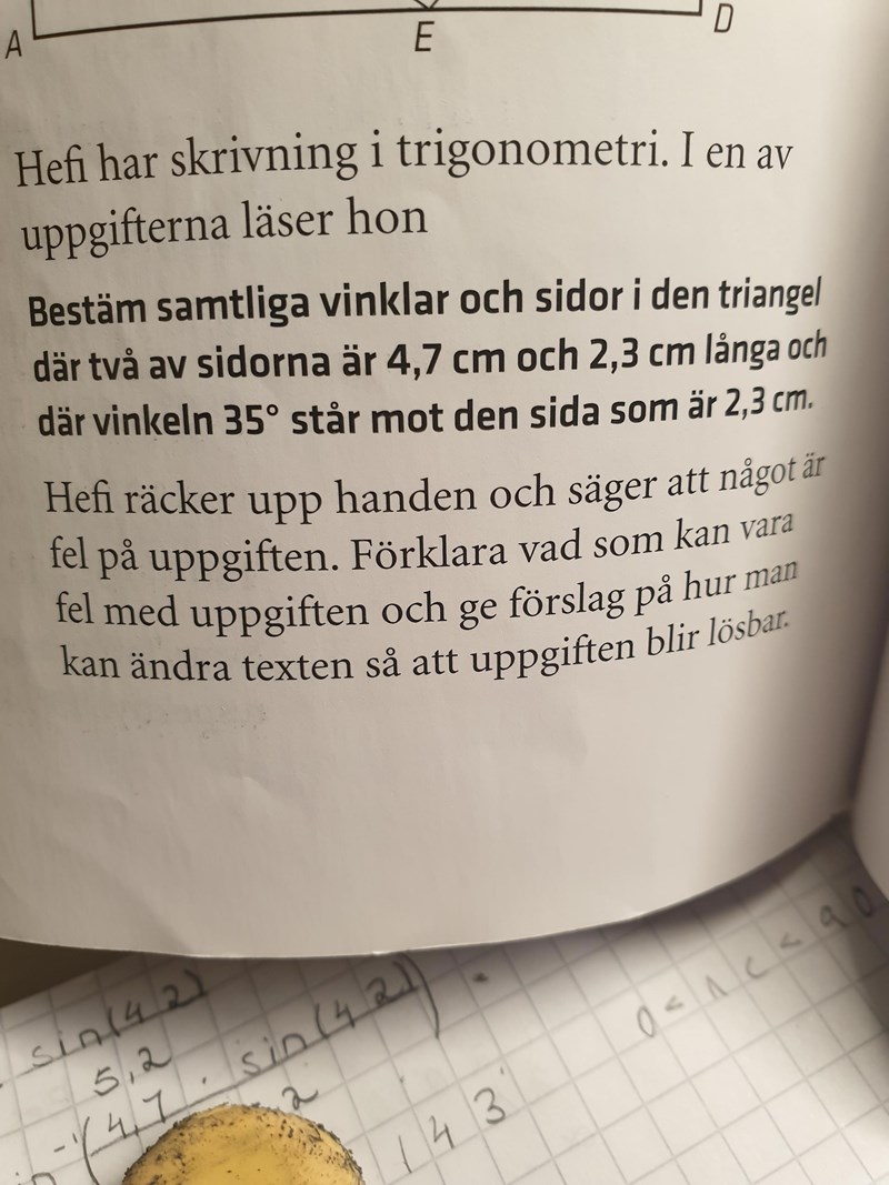 Så som jag tolkar uppgiften så räcker det att rita upp de båda trianglar som stämmer med intruktionen i uppgiften och visa att det inte bara finns en enda triangel som fungerar, utan två. Alltså borde uppgiften formuleras om till "Bestä samtliga vinklar och sidor i de trianglar där två av sidorna är 4,7 cm och 2,3 cm långa och där vinkeln 35o står mot den sida som är 2,3 cm." Det står inte i uppgiften att man skall göra själva beräkningarna.