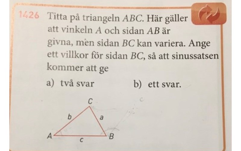 När vi känner till en vinkel och två av sidorna så kan sinussatsen ge två svar.. Om man känner till en vinkel och en sida då bör sinussatsen ge ett svar?