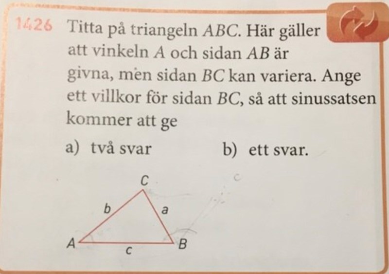 Jag tänker att om vinkeln inte är angiven då kommer vi få ett visst sinusvärde, två vinklar kommer kunna ge samma sinusvärde. Alltså om vi exempelvis får att vinkeln till att bli B, då är ju den andra vinkeln 180-B. Men om vinkeln B däremot är angivet så kommer vi inte kunna skriva att ena vinkeln är B och den andra 180-B.. Är jag på rätt spår? Eller?