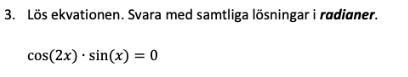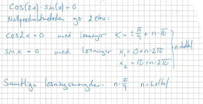 Samtliga lösningar är alltså eller . Svaret du har laddat upp är alltså fel, för där har man även med lösningarna , som inte gör att ekvationen stämmer (t ex om man stoppar in så är cos(2x) = -1 och sin(x) = 1 så produkten blir inte 0).