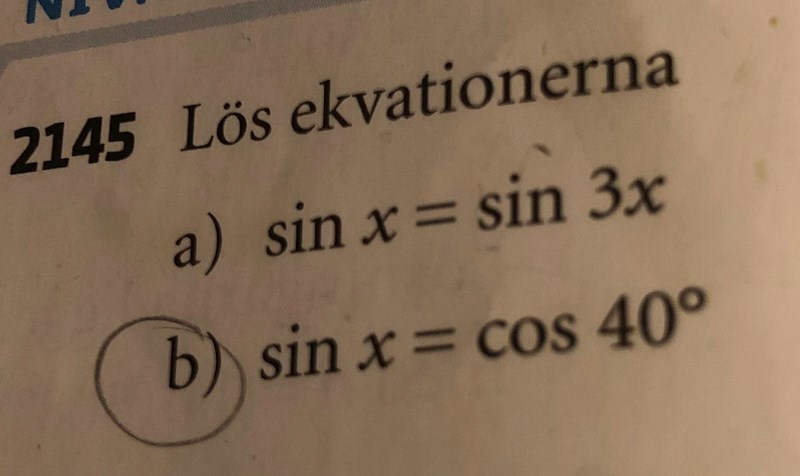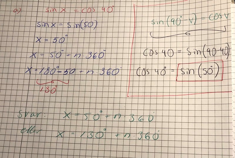 Du kan skriva cos(40°) som ett sinusuttryck med hjälp av en formel. Leta i din formelsamling eller här.