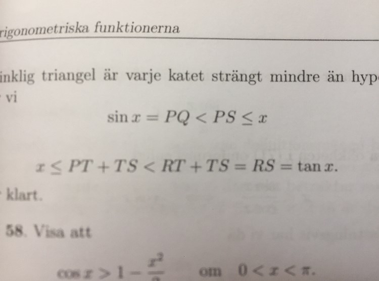 Figuren visar att linjen från Q till P är kortare än denna cirkelbåge, som i sin tur är kortare än linjen från S till R. Uttryckt i matematisk notation: