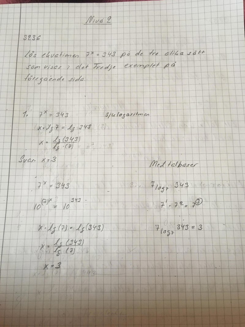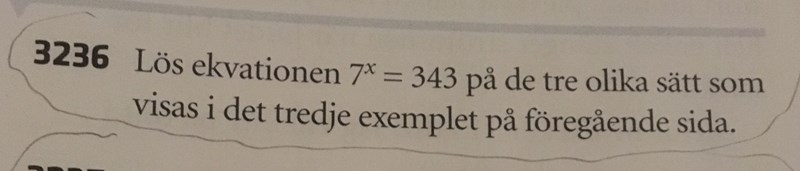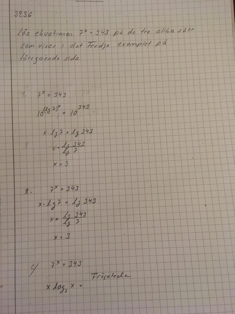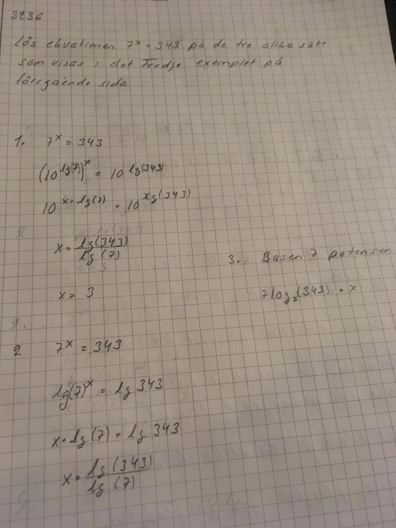- Metod 3 bör vara att skriva om baserna i bägge led (dvs 7 i och 343 i ) till basen 10, dvs