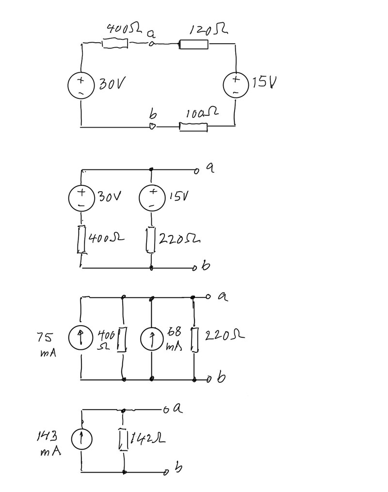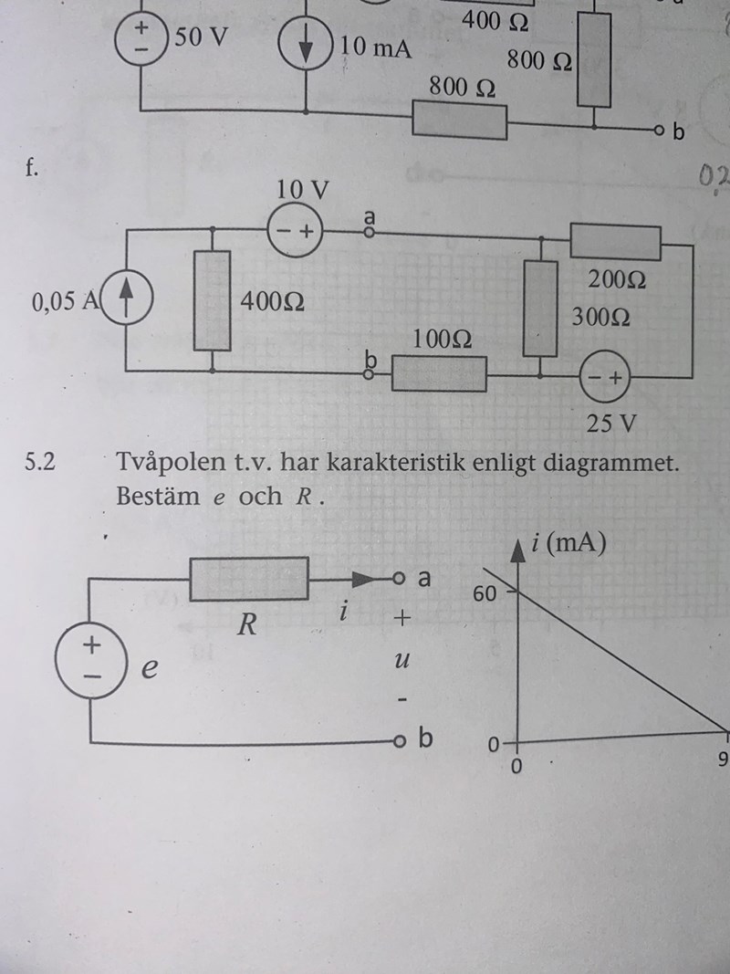 Bedyrar att jag ska sluta tjata om tvåpolsatsen och gå vidare, men vill bara försöka förstå fråga f också. Detsamma gäller som vid de tidigare tillfällen, man ska förenkla kretsen och lösa ut e(V) och Rt. Jag antar att jag kanske bör gå tillbaka till grunderna och repetera (vilket jag kommer göra oavsett). Vad som förvirrar mig i detta problem är ju att a och b sitter inbyggda i kretsen. Samt blir det nog fel någonstans när jag försöker avgöra vilka kretsar som är parallella/i serie med varandra. Mina svar är givetvis felaktig, är ju därför jag kommer hit :) men det kanske kan ge en hint om min tankegång. Jag har delat upp min lösning i 4 steg och jag tror att det är på det fjärde steget allt går käpprätt och skogen (kan givetvis vara tidigare också…).