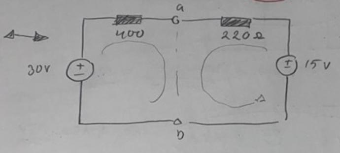 Sen har du räknat ut vilka strömmar som flyter i a-b när man kortsluter. Du summerar strömmarna från vardera spänningskällan och får sedan Rut = Uab/Itot